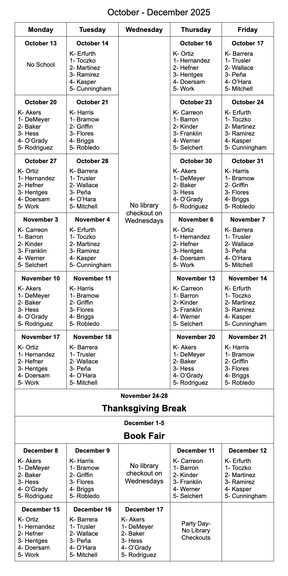 To help families remember the dates that library books are due, we have created a calendar of library class checkout days below. This will be updated quarterly.